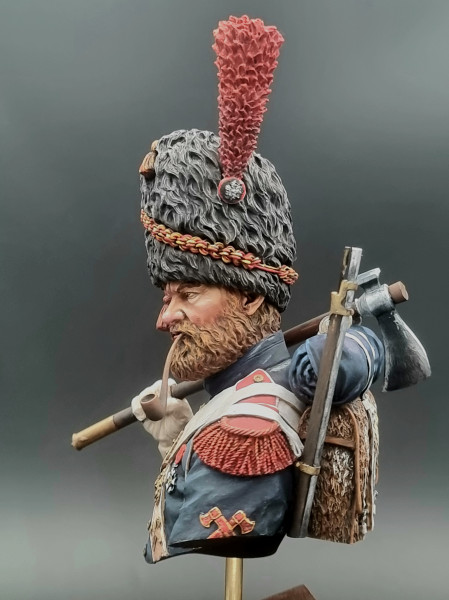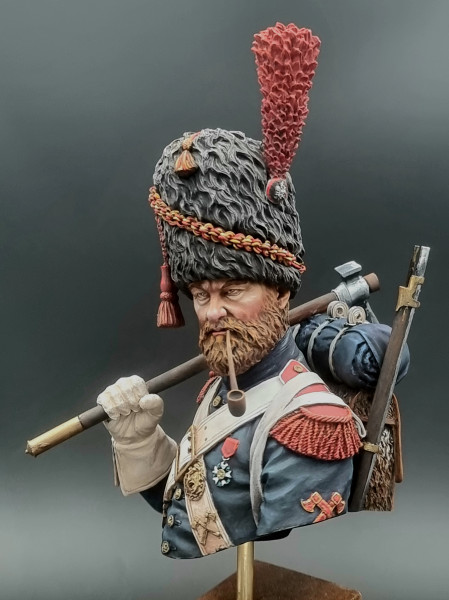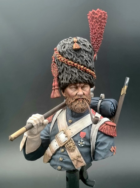 Les grenadiers à pieds de la garde impériale trouvent leur origine dans les grenadiers de la Convention et la garde du Directoire, qui participent au coup d’état du 18 Brumaire et sont réunis dans la Garde consulaire le 28 novembre 1799. L’effectif des grenadiers de la garde est alors d’un régiment, divisé en deux bataillons de six compagnies, chaque compagnie comptant quatre-vingt grenadiers dirigés par quatorze sous-officiers, deux officiers et deux tambours ; à l’ensemble s’ajoute l’état-major du régiment et une bande de musiciens. Les grenadiers de la Garde consulaire participent à la campagne d’Italie, où ils servent de réserve à Bonaparte. À Marengo, leur intervention stabilise la ligne française au moment où elle commençait à fléchir et lui permet de tenir jusqu’à l’arrivée de Desaix. Source : wikipedia
